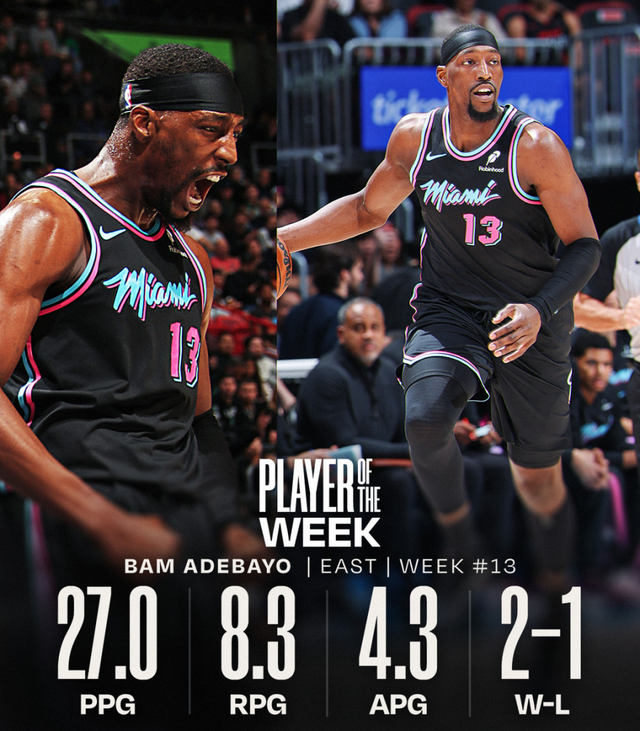 过去一周,阿德巴约率领热火也打出2胜1负的战绩,场均27分8.3篮板4.3助攻,三分命中率56.5%。