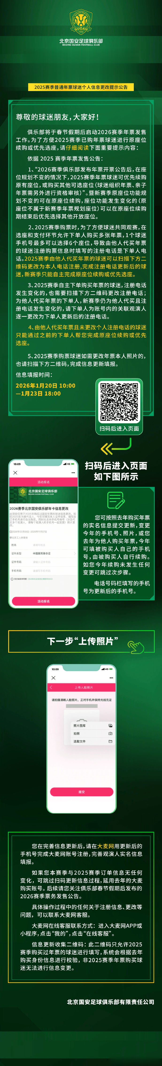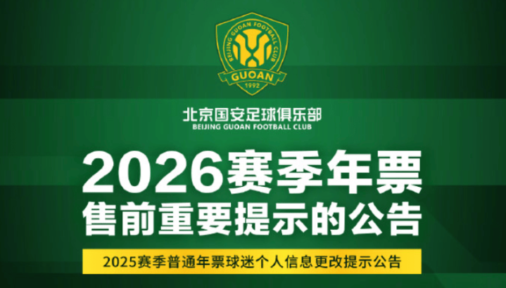 虎扑01月20日讯北京国安俱乐部官方发布了2026赛季年票售前重要提示的公告。