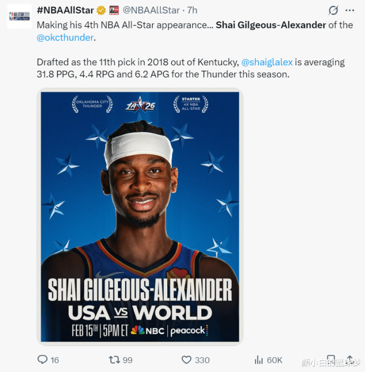 第二个喜讯就是SGA成为了西部全明星先发球员,他也是连续三年入选全明星先发,生涯第四次入选全明星,他的球迷投票2345743排在第四位,球员投票排在第三位,最终他在西部的全明星排位是第三。