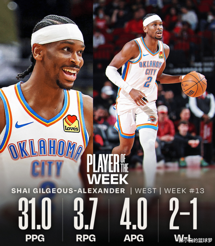 在这场比赛之前,SGA已经迎来了三个喜讯,开云第一个就是SGA成为上周的周最佳球员,他场均31分4助攻3.7篮板。