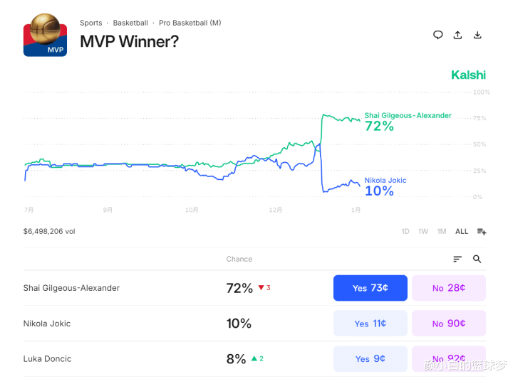 第三个喜讯就是尼古拉-约基奇还没有复出,约基奇已经连续缺席11场比赛了,亚历山大的MVP概率已经提升到72%,约基奇的MVP概率只剩下10%。