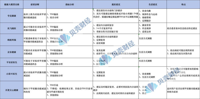 在这份体检报告中,TSH(促甲状腺激素)指标高于参考值,因此成为几个大模型共同关注的指标。贝壳财经测评发现,7个大模型应用均分别分析了特殊指标和其余指标,其中,仅百度文心健康根据出现异常的指标分析了其他项正常指标可能存在问题,提示尽管另一项指标T3处于正常值范围,但结合TSH升高,考虑用户T3指标可能偏低。