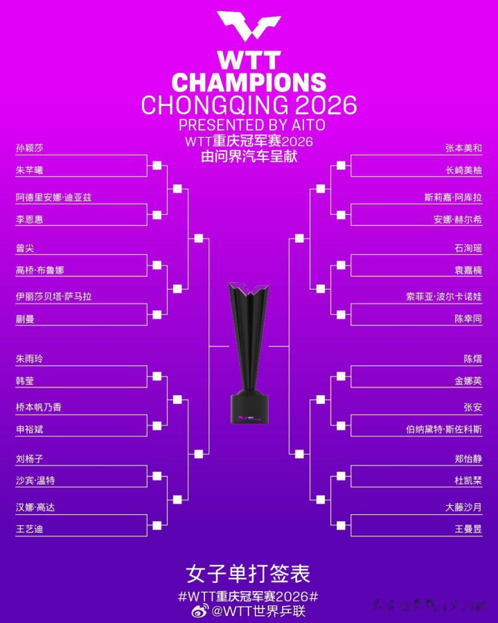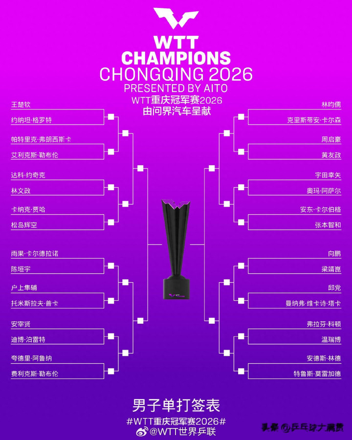 2026年WTT重庆冠军赛抽签出炉(3月10日进行比赛)。男片面,陈垣宇首轮大战雨果;向鹏迎战梁靖崑,周启豪迎战黄友政。