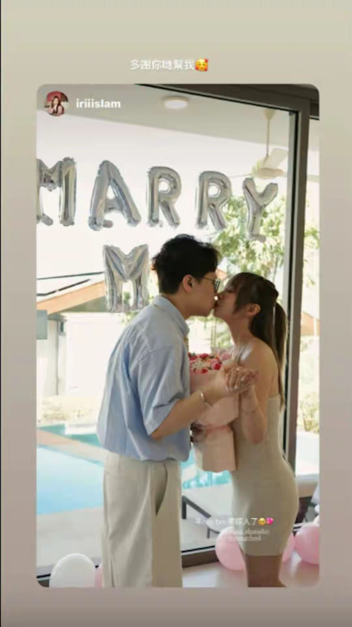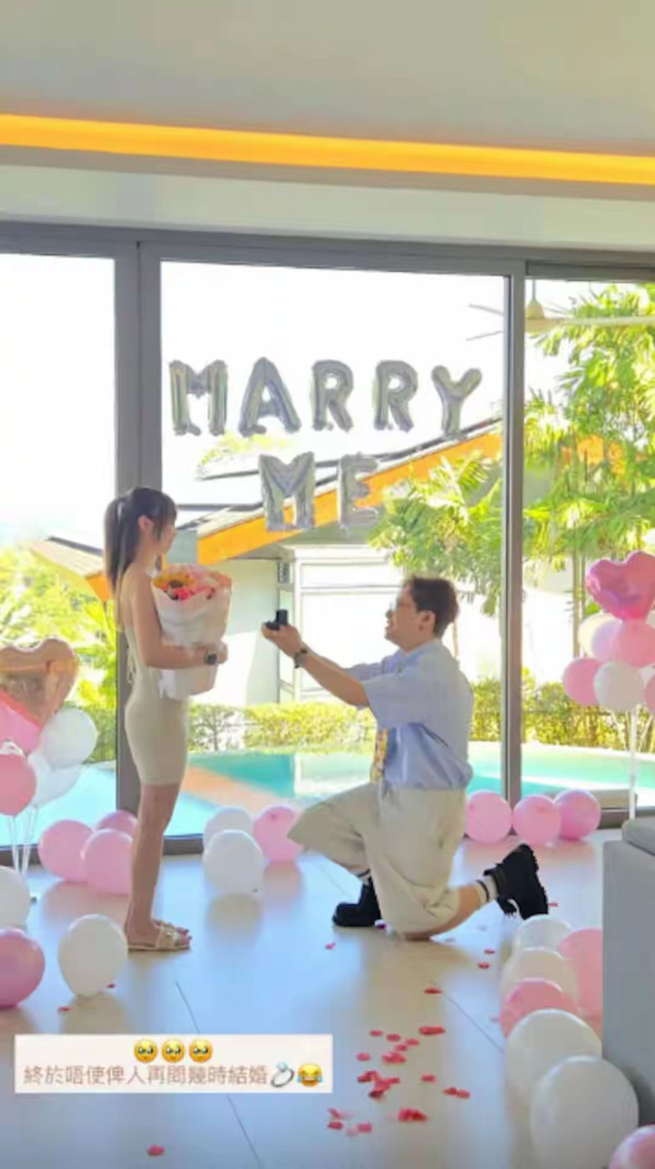 黄荣璋此次是在酬酢平台我方报的喜,港媒写得也很细,他向走动多年的KOL女友Emily求婚得胜,现场是一派粉白气球,背面挂着“MARRY ME”的灯牌,他单膝跪地,把领域递出去,女方点头答理。