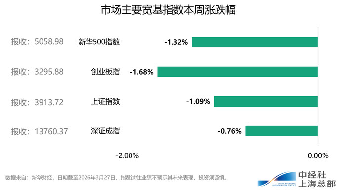 本周(3月23日至3月27日)A股市集主要宽基指数先抑后扬。其中,上证指数周度下落1.09%,深证成指周度下落0.76%,创业板指周度下落1.68%,新华500指数周度下落1.32%。新华500指数本周探底回升,开盘报5046.12点,至27日收盘报5058.98点,全周振幅3.6%,成交额为3.81万亿元。
