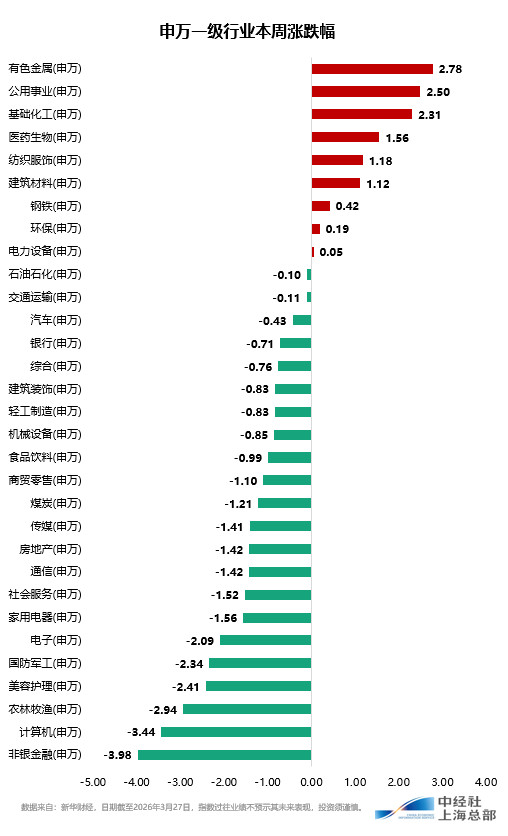 从申万一级行业来看,本周行业指数涨少跌多,有色金属、公用工作、基础化工等行业指数涨幅居前,非银金融、计较机、农林牧渔等行业指数跌幅较大。