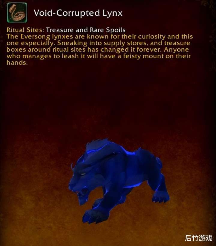 《魔兽寰宇》12.0.5的PTR(全球测试服)新增一款史诗坐骑“虚空腐朽的山猫”(Void-Corrupted Lynx),玩家可通过订单交付制皮师为我方打造。