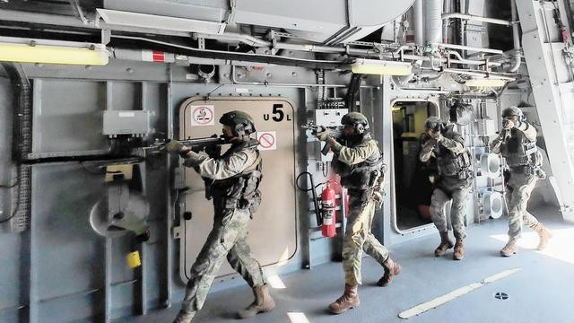 解救被劫持船舶科目中,特战队员乘坐小艇出击。