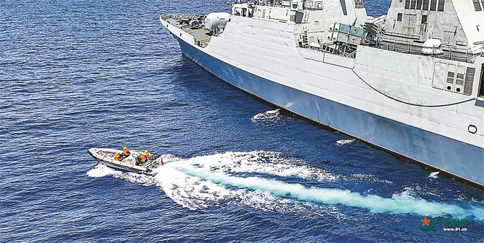 舰载直升机紧急升空侦察,及时报告情况。指挥所综合研判海洋流速、海面气象等因素影响,科学制定搜救方案,高效组织分区协同搜索。舰艇高速机动,抵达救援点位后随即布放小艇,对落水人员实施救援。