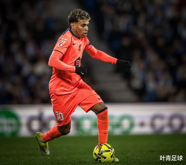 亚马尔奔跑庆祝,但VAR介入,与主裁吉尔-曼萨诺进行沟通。曼萨诺单臂高举,示意亚马尔越位在先,进球无效。