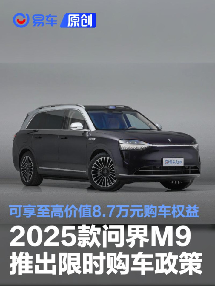 易车讯1月19日,鸿蒙智行宣布即日起至2月2日,2025款问界M9推出限时购车政策,可享至高价值87000元购车权益。