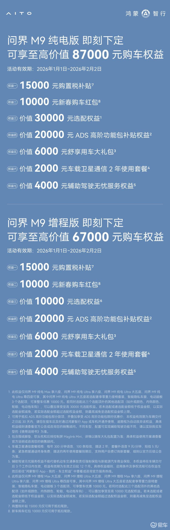 其中问界M9纯电版即刻下定可享至高价值87000元购车权益,包含15000元购置税补贴;10000元新春购车红包;价值30000元选配权益;价值20000元ADS高阶功能包补贴权益;价值6000元舒享用车大礼包;价值2000元车载卫星通信2年使用套餐;价值4000元辅助驾驶无忧服务权益。问界M9增程版即刻下定可享至高价值67000元购车权益,亚博app除了可享价值10000元选配权益,开云官方app其余权益与纯电版保持一致。