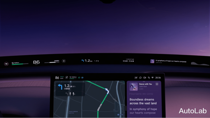 小米YU7的P-HUD由3块11.98英寸的长条投影组成,贯穿了前挡风玻璃底部。