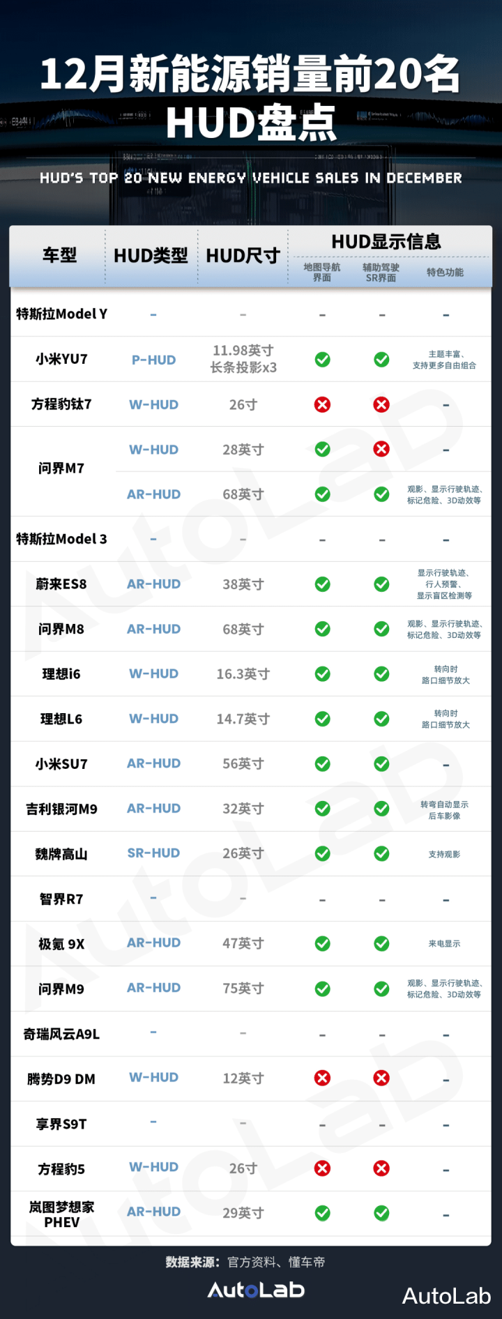 这次我们整理了去年12月新能源车销量前20名HUD的信息,跟大家一起看看2025年过去后,HUD都进化到什么程度了,以及除了基础行车信息、箭头指引导航、雪地模式等都有的功能,这些HUD之间到底还有哪些差异。