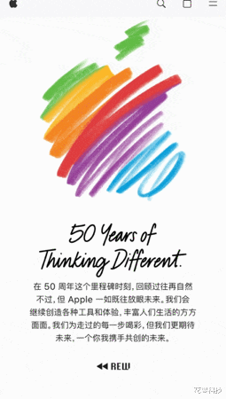 用 iPhone 翻开苹果官网的话,点击底部的「REW」,还会播放一段苹果居品的回归视频。